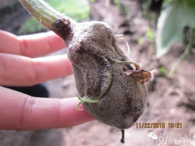 图3:带病的残落花瓣落到作物的茎秆上、果实上成为一个主侵染源,此部位成为一个发病中心,估计这个茎秆和这个茄子难逃一劫了……