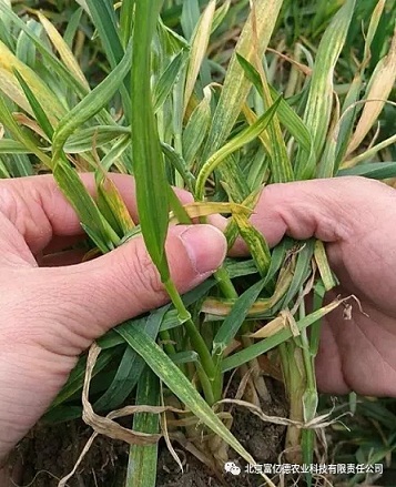 (2)土传花叶病毒病:未展开的心叶上出现褪绿的短线条状斑,随着病情发展,条斑彼此联合成不规则的淡黄色短线条状斑驳,整个叶片呈现出花叶症状。与小麦梭条斑花叶病十分相似,不易区分。
