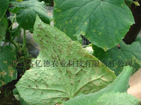 症状:主要为害叶片、叶柄和幼瓜,整个生长期病菌均可为害。病斑受叶脉限制叶正面呈小型多角形,与霜霉病症状易混淆。但是细菌性角斑感病后期病斑逐渐变灰褐色,棚室温湿度大时,叶背面会有白色菌浓溢出,这是区别于霜霉病的主要特征。干燥后病部变脆易穿孔。