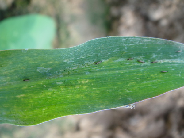 蓟马主要在玉米心叶内为害,同时会释放出黏液,致使心叶不能展开。随着玉米的生长,玉米心叶形成“鞭状”,如不及时采取措施,就会造成减产,甚至绝收。